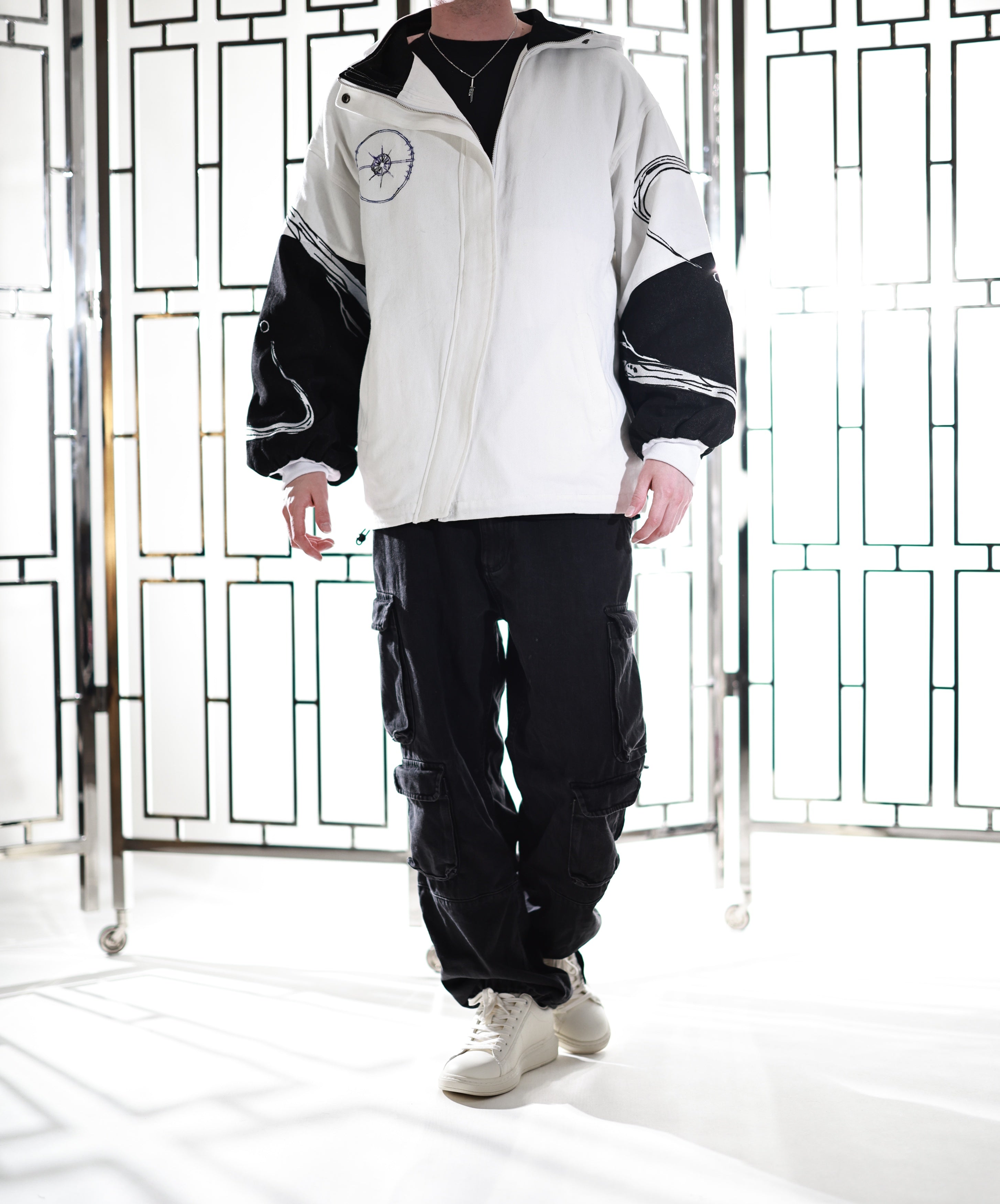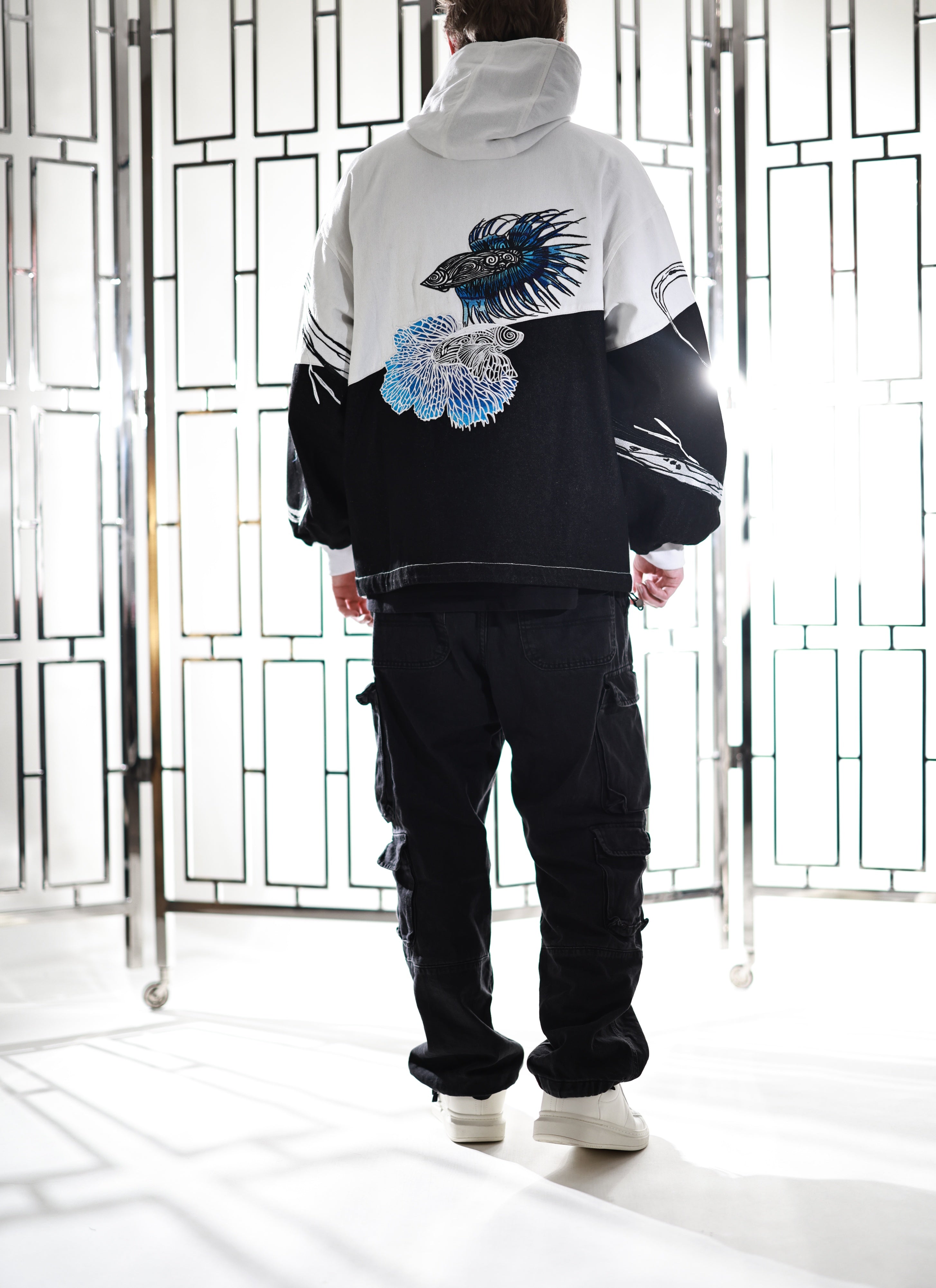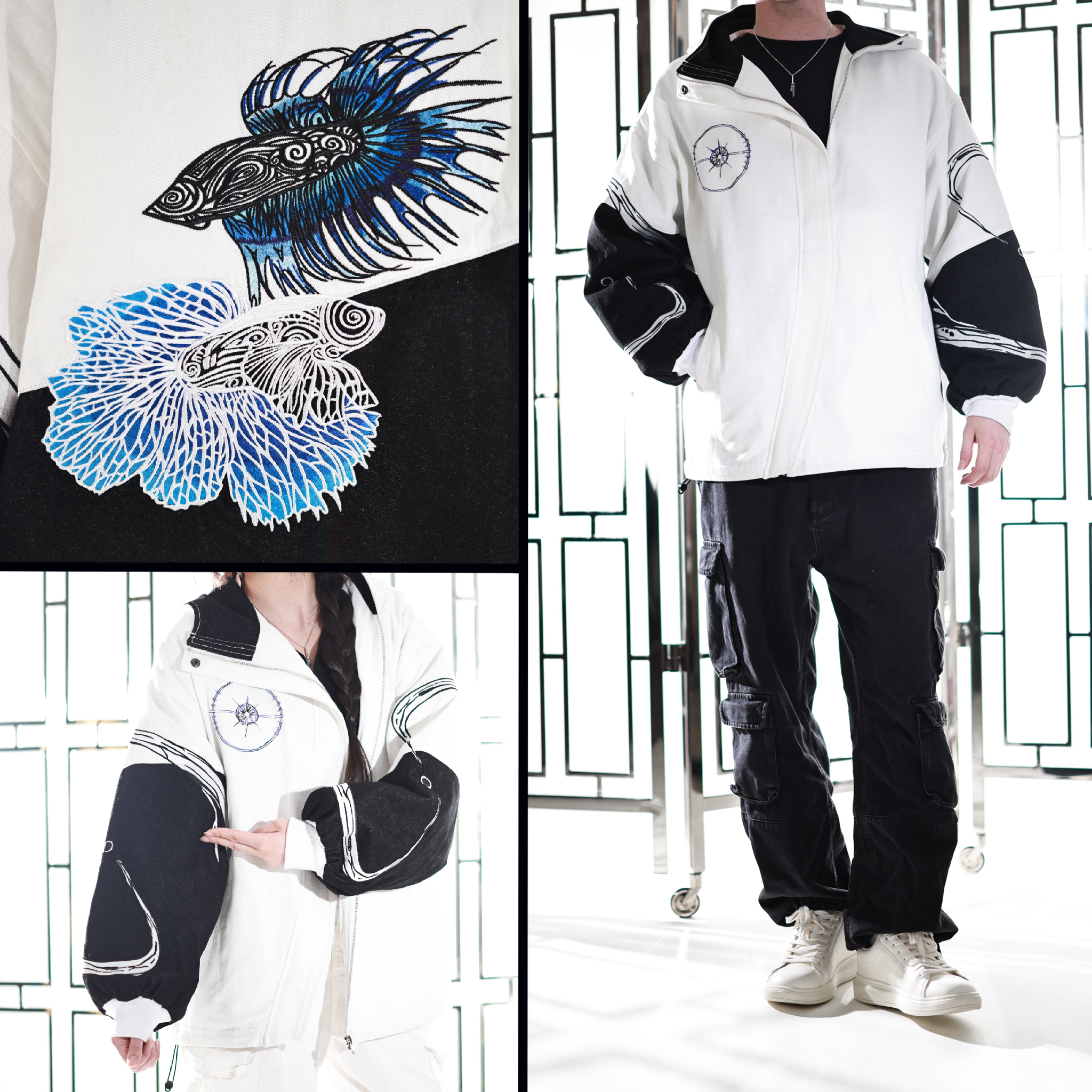 This whole collection features some of the highest quality items we have made. The jacket is made from a mix of highest quality 100% cotton & denim fabrics. The jacket also has very soft lining which ensures comfort when you wear it and keeps you warm during colder days. Our goal is to make subtle cosplay and casual anime inspired outfits in the same quality as regular clothing from luxury brands. This jacket is no exception. It is made to last so that you can comfortably wear as your every day jacket it in public or as a subtle cosplay at conventions. All details on the jackets are fully embroidered. It features and enlarged and more detailed version of our Beta fish embroidery on the back featuring beautiful gradients. The sleeves additionally feature two embroidery patterns inspired by G's infinity spanning from top to bottom. Since the jacket is not made from regular cosplay fabric, it is perfect to casually wear & to stand out in a positive way.