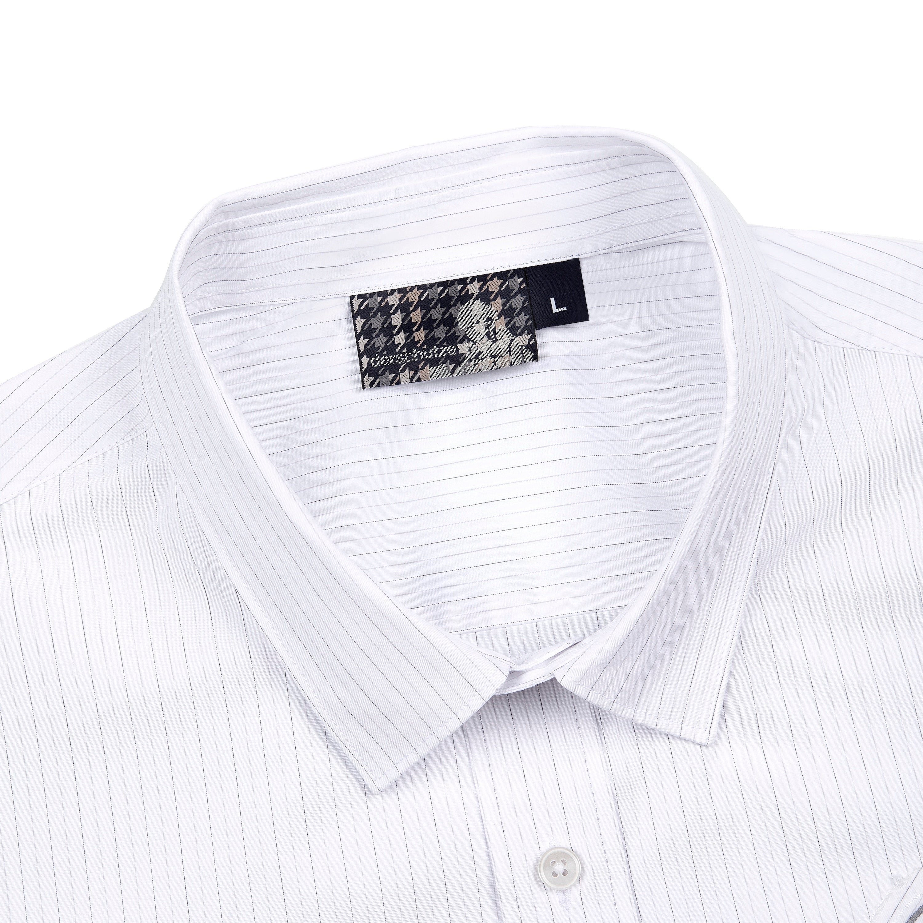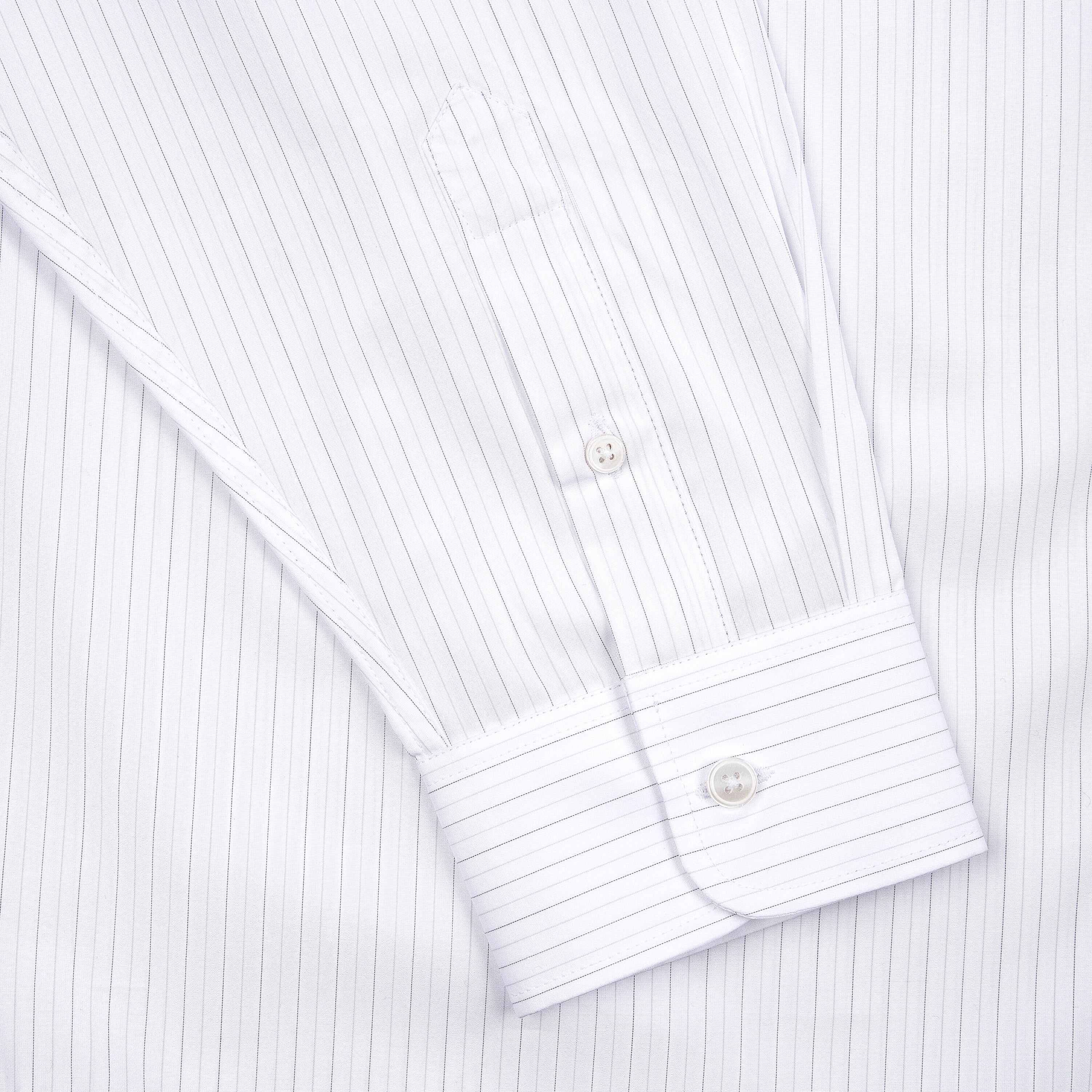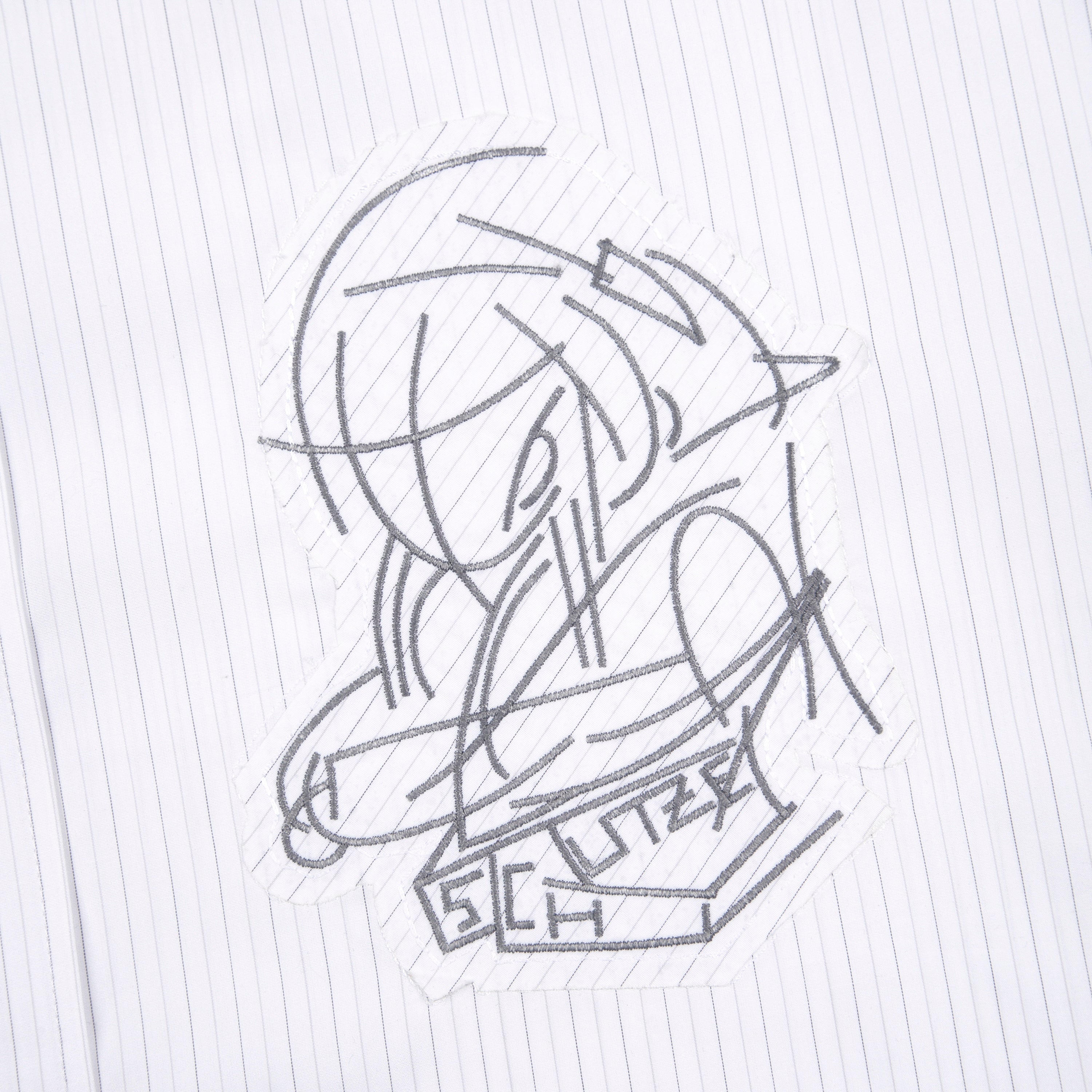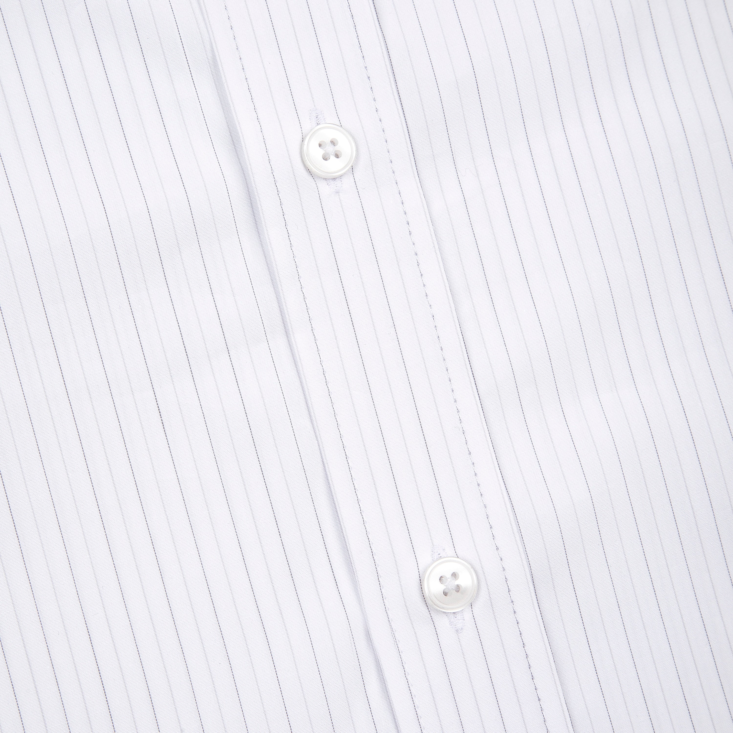 100% cotton / white-grey striped / embroidery on front / custom buttons / curved hem / relaxed fit / fits true to size