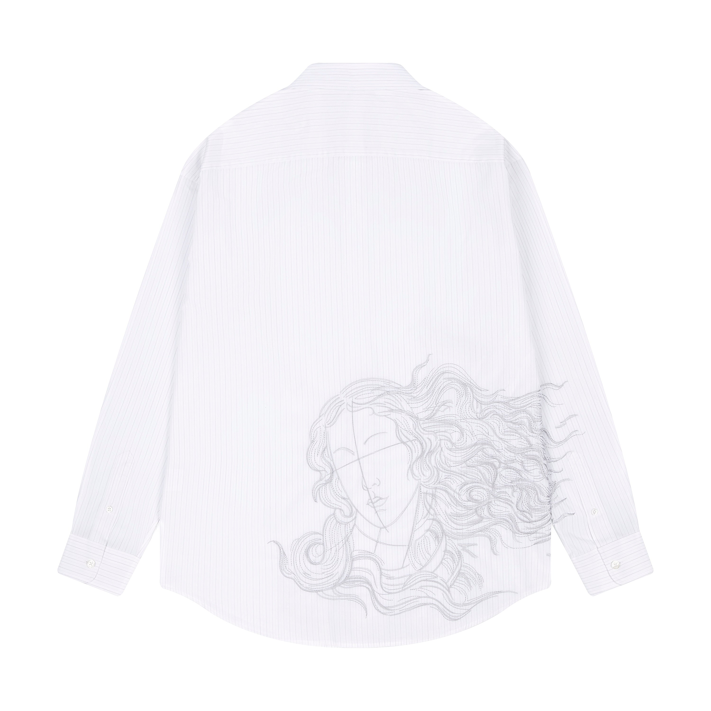 100% cotton / white-grey striped / embroidery on back and sleeve / customized "derschutze" buttons on front, collar and cuffs / curved hem / relaxed fit / fits true to size